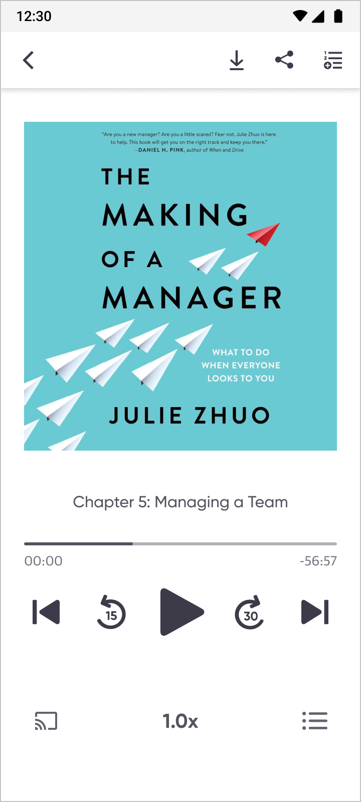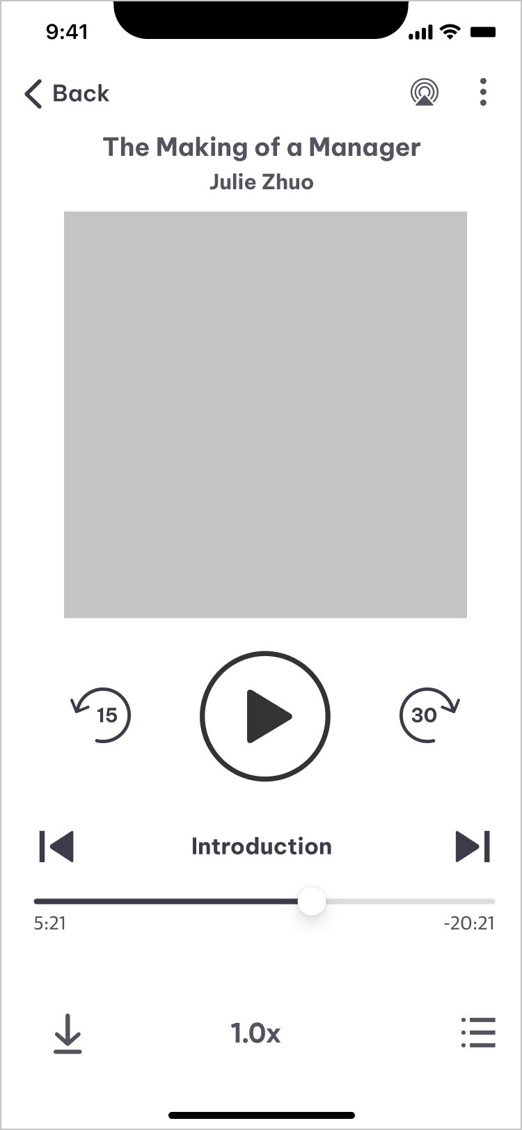 Full-screen audio player with playback fundamentals (play, pause, scrub, chapter navigation)