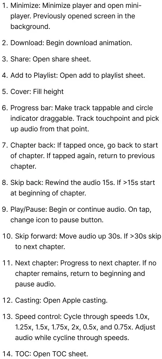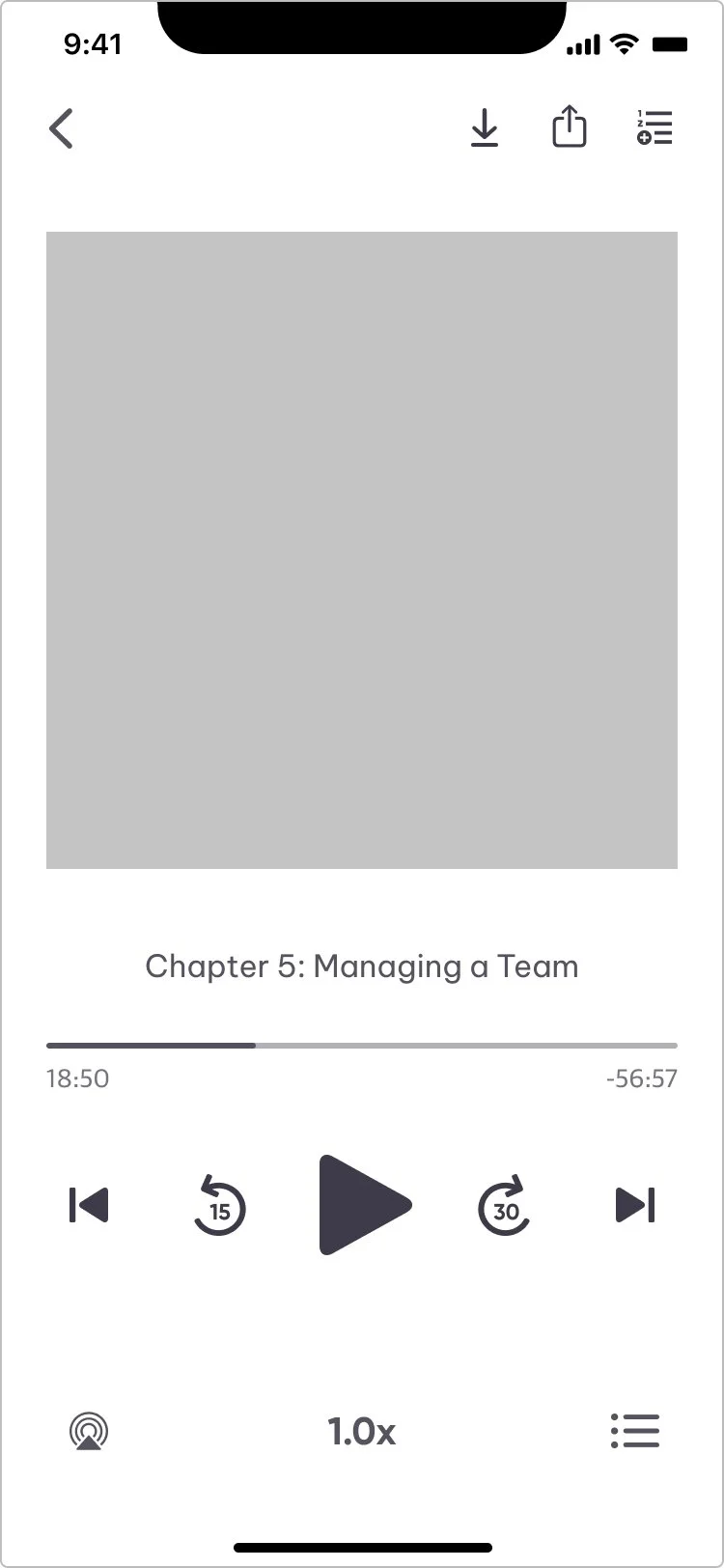 Partnered with engineering to validate feasibility and turn research-backed feature list into MVP. I prioritized five features beyond core playback based on engineering feasibility and direct evidence from user feedback and behavioral data: background playback, lock-screen controls, chapter navigation, speed control, and offline downloads.Designed for cross-platform consistency with platform-specific intelligence