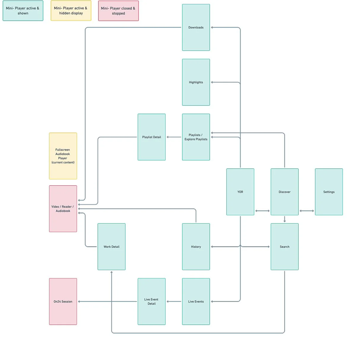 I created end-to-end user flows for the MVP audio player to define how listening works across the app and outside the player screen. I mapped key entry points (audiobook detail, search, library and downloads, and resume listening) and designed rules for the mini-player state: when the mini-player appears, when it persists while users browse other content, and when it should hide (for example, switching to video or no active audio session).