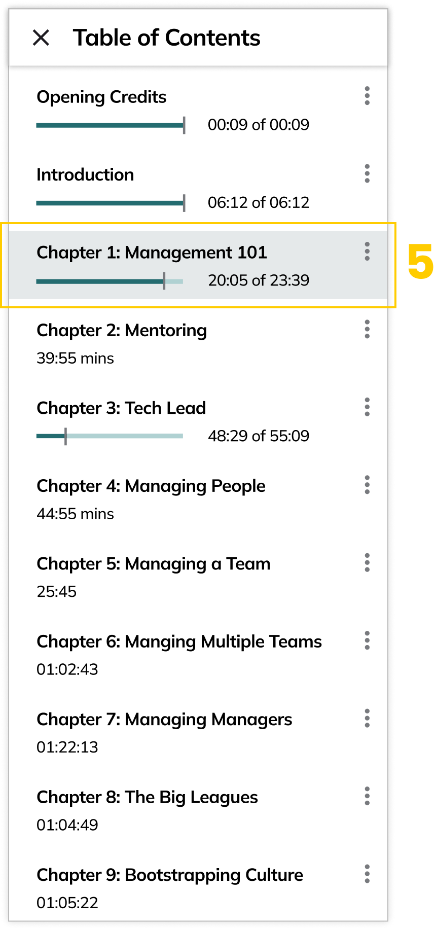 5. Visual indicator for time left: Quick indicator for user to measure chapter placement.